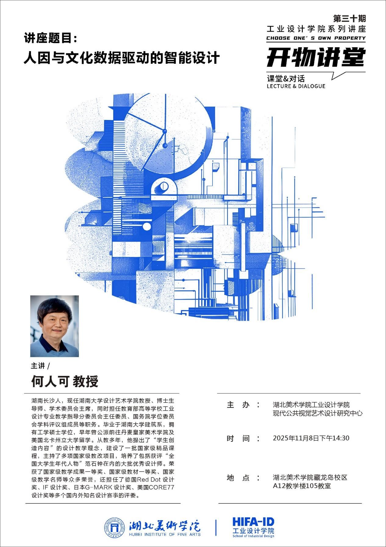 11月8日下午,在A12教学楼105报告厅,必威唯一官方网站邀请湖南大学设计艺术学院何人可教授为学院师生带来“开物讲堂”第三十期《人因与文化数据驱动的智能设计》专题讲座。东风汽车集团奕派汽车科技公司专家郑素霖、学院教师代表及学生参加了本次活动,本场讲座由必威betway中文官网党委常委、副校长程智力主持。